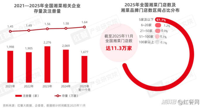 近年來,湘菜作為中式正餐中體量較大、成長性較為突出的重要賽道之一,相關(guān)企業(yè)數(shù)量保持穩(wěn)定增長。據(jù)企查查數(shù)據(jù),截至2025年11月,湘菜相關(guān)企業(yè)存量達到1.64萬家;2025年前11個月,湘菜相關(guān)企業(yè)注冊量達到1,677家。