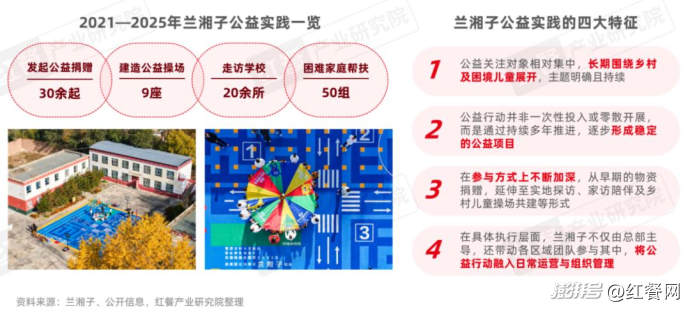 在此背景下,主動承擔社會責任已成為餐飲品牌構(gòu)建長期信任與情感價值的重要途徑。在湘菜賽道中,蘭湘子自2021年起,圍繞鄉(xiāng)村教育及兒童成長持續(xù)開展相關(guān)公益項目。一方面,蘭湘子聯(lián)合美團、壹基金推進鄉(xiāng)村兒童操場公益項目,累計捐建9座操場;另一方面其通過自主對接學校、困難家庭及殘障兒童機構(gòu),開展圖書和運動器材等物資捐贈、入戶家訪及生活物資幫扶等公益活動。蘭湘子積極將社會責任系統(tǒng)化地融入品牌經(jīng)營發(fā)展戰(zhàn)略中,使公益成為品牌價值的重要組成部分。