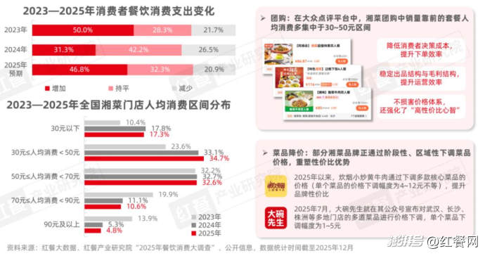 近年來,消費者的餐飲消費較為審慎。據(jù)紅餐產(chǎn)業(yè)研究院調(diào)研,2024年餐飲消費支出增加的消費者占比較2023年大幅下降,對于2025年的餐飲支出預期,超過半數(shù)的消費者表示其2025年餐飲消費支出將有所下降或保持不變。在性價比需求持續(xù)增長的大背景下,團購、菜品降價等方式逐步成為部分湘菜品牌穩(wěn)定客流、提升吸引力的重要手段。