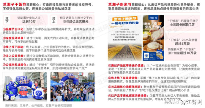 以蘭湘子為例,其2023年打造了“干飯節(jié)”“新米節(jié)”活動,并逐步形成年度化、體系化的品牌節(jié)日IP,截至2025年已連續(xù)舉辦三屆。2025年,蘭湘子擴大了“干飯節(jié)”“新米節(jié)”等系列活動規(guī)模,并進一步優(yōu)化活動玩法與策略,不僅有效拉近品牌與消費者的距離,強化品牌心智,還實現(xiàn)公域流量向私域流量轉(zhuǎn)化,形成完整的營銷閉環(huán)。