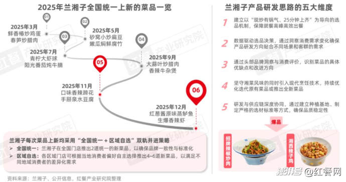以蘭湘子為例,其在產(chǎn)品策略上以“品質(zhì)與效率優(yōu)先”為核心,強調(diào)現(xiàn)炒鍋氣,并通過精簡的菜單結(jié)構(gòu)(菜品SKU長期保持約28道),保障后廚出餐效率、產(chǎn)品品質(zhì)穩(wěn)定性。同時,蘭湘子持續(xù)強化產(chǎn)品研發(fā)能力,通過“全國統(tǒng)一+區(qū)域自選”的新品策略穩(wěn)定產(chǎn)品上新節(jié)奏,為消費者提供持續(xù)的新鮮感。在這一系統(tǒng)化研發(fā)體系支撐下,蘭湘子成功打造出招牌辣椒炒肉、湘西辣子雞等多款高復購、高銷量的核心爆品,持續(xù)夯實品牌的綜合競爭力。