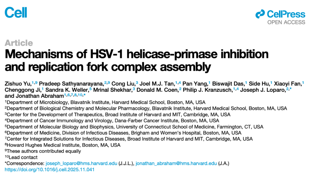 2025 年 12 月 29 日,哈佛醫(yī)學(xué)院 Jonathan Abraham 團(tuán)隊(duì)(博士后于子朔為論文第一作者)在國際頂尖學(xué)術(shù)期刊 Cell 上發(fā)表了題為:Mechanisms of HSV-1 helicase–primase inhibition and replication fork complex assembly 的研究論文。