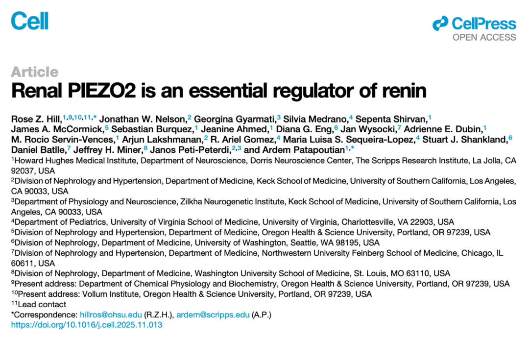 近日,諾貝爾獎得主、斯克里普斯研究所 Ardem Patapoutian 教授團(tuán)隊(duì)在 Cell 期刊發(fā)表了題為:Renal PIEZO2 is an essential regulator of renin 的研究論文。