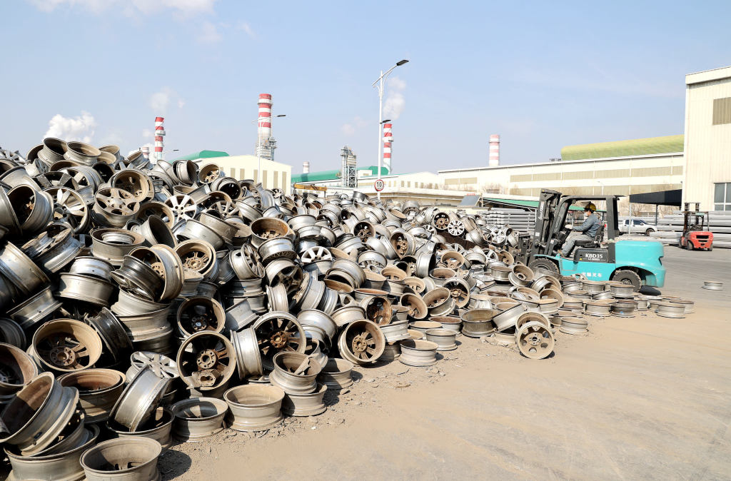 2025年2月24日,在山東省濱州市陽(yáng)信縣一家再生鋁企業(yè)車間內(nèi),工人駕駛叉車搬運(yùn)回收的廢舊輪轂。 視覺(jué)中國(guó) 圖