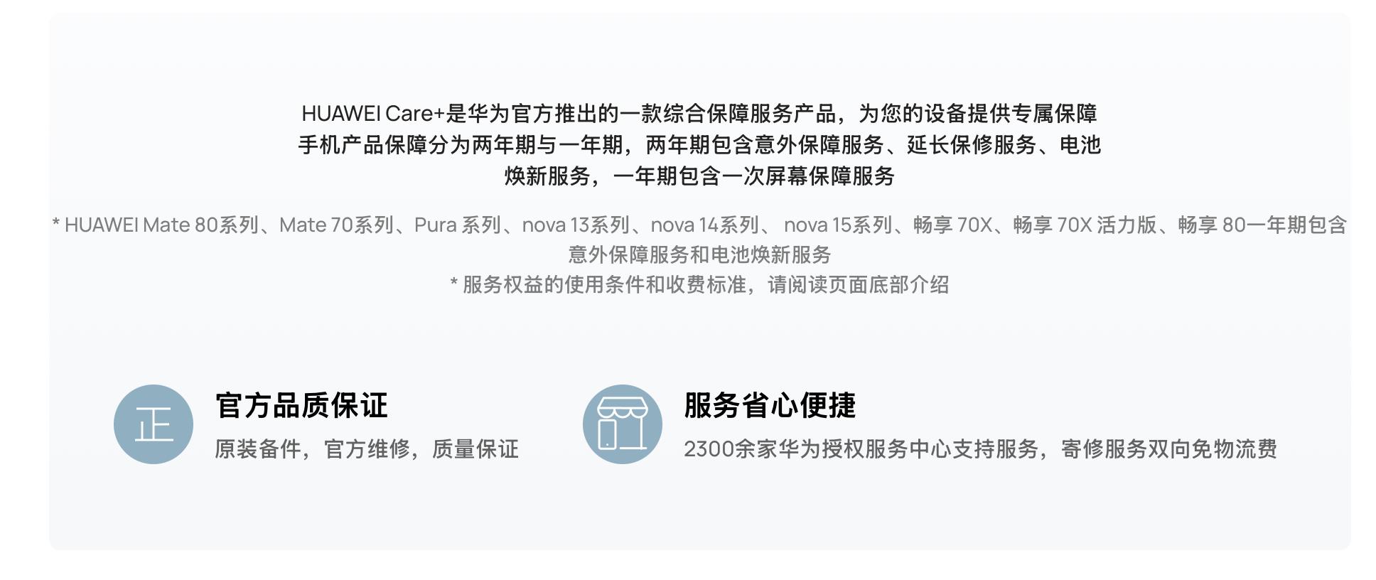 但與此同時(shí),HUAWEI Mate 80 系列、Mate 70 系列、Pura 系列、nova 13 系列、nova 14 系列、 nova 15 系列、暢享 70X、暢享 70X 活力版、暢享 80 等機(jī)型的一年期 HUAWEI Care+ 又包含意外保障服務(wù)和電池?zé)ㄐ路?wù)。