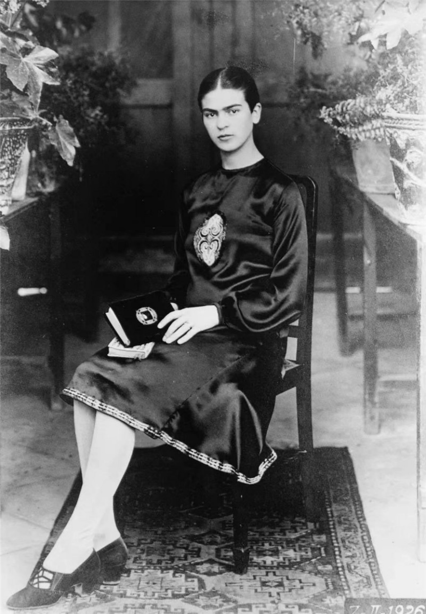 學(xué)生時(shí)期的弗里達(dá)·卡羅,攝于1926年。1925年9月17日,因在電車上發(fā)生事故,弗里達(dá)的脊椎、臀部和右腿受重傷。 這張照片是他父親在那次可怕事故發(fā)生一年后拍攝的。