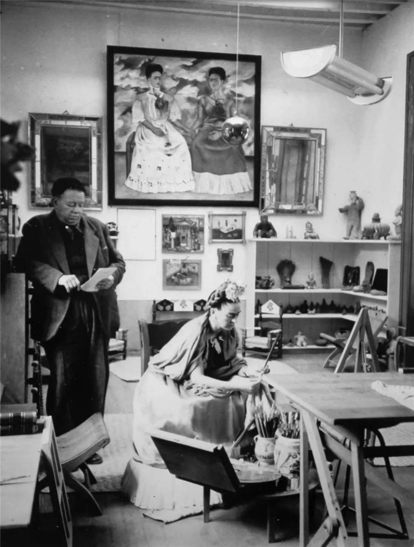 弗里達(dá)與迭戈在藍(lán)房子的工作室,身后是畫作《兩個(gè)弗里達(dá)》 1943年,這張照片在2023年曾在中國深圳展出。