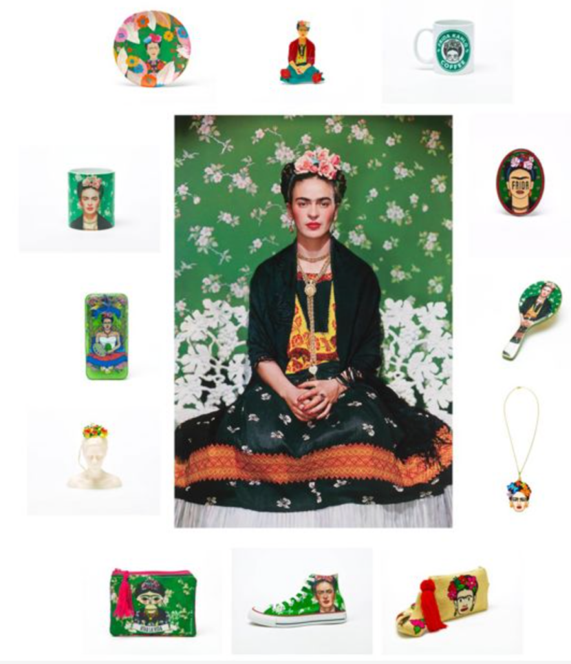 尼古拉斯·穆雷的攝影作品《紐約白長椅上的弗里達(dá)》 周圍環(huán)繞著以這張照片為靈感創(chuàng)作的商品 合成圖 ? 休斯敦美術(shù)博物館