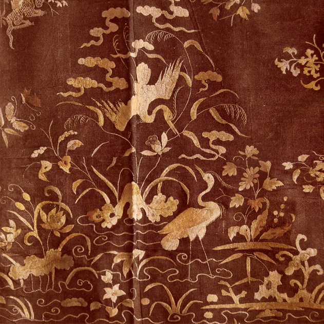 至于宮詞中提到的“御衫繡作滿池嬌”一語,考古學(xué)家雖然尚未找到文宗御衫實(shí)物,但內(nèi)蒙古元集寧路故城遺址的窖藏中,出土了一件繡有“滿池嬌”紋樣的夾衫。夾衫之上,共繡出大小圖案九十九組(九與其倍數(shù)是蒙古族的吉祥數(shù)字),兩組大的“滿池嬌”圖案出現(xiàn)在雙肩,具體內(nèi)容是配以白鷺的池塘小景,雙鷺一立一翔,祥云飄動(dòng),碧水生波,蓮荷盛開,一派靜謐安寧景象。