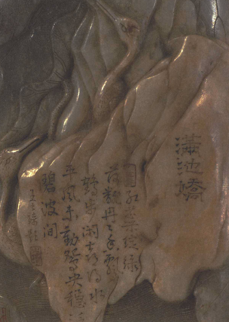 遼、金滅亡后,作為裝飾的春水題材,在元代并未衰敗,圖案的內(nèi)容反而更豐富,漢文化的風(fēng)情也更濃郁了。無錫錢裕墓(年代為元延祐七年,1320)出土一副“春水”玉帶扣,中間一只天鵝脖頸細(xì)長,試圖隱入茂密的植物之中,上方一只細(xì)身長尾的海東青正在回首尋覓,帶扣與帶鉤上的琢制圖案,已經(jīng)出現(xiàn)了荷花、蓮蓬、荷葉等。上海青浦縣重固鄉(xiāng)元代任氏墓地出土玉帽頂,圖案是荷葉蘆葦掩映下悠閑的鷺鷥,與“滿池嬌”圖案的親緣關(guān)系,顯然已經(jīng)很近了。