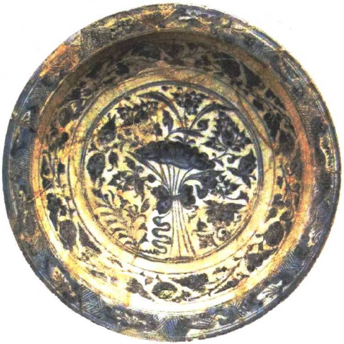 如果我們將目光轉(zhuǎn)向西方,也會(huì)發(fā)現(xiàn),與滿池嬌類似的圖案被繪制在當(dāng)年的西方陶器上。同為蒙古人建立的欽察汗國(金帳汗國),其都城拔都薩萊在伏爾加河下游,今為俄羅斯的阿斯特拉罕。這里出土過許多白地藍(lán)花14世紀(jì)陶器,不少還以氧化鈷在釉下繪畫圖案,裝飾常與元青花相近。尤其是束蓮圖案,構(gòu)圖與題材形象仿佛是滿池嬌的無水禽版本。在西亞,還出現(xiàn)了與滿池嬌更相似的紋飾,見于敘利亞出土的一件白地藍(lán)花大盤。此件大盤被當(dāng)?shù)乜脊艑W(xué)家推測(cè)為1401年以前的作品。