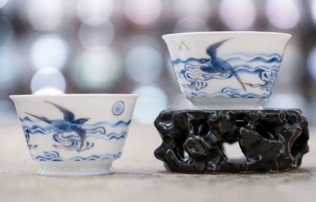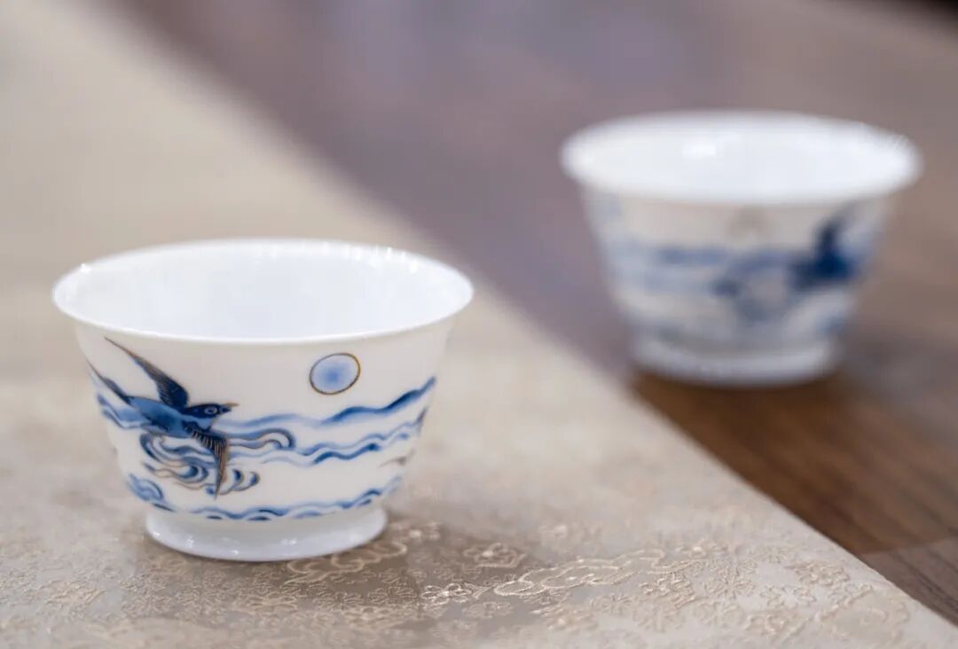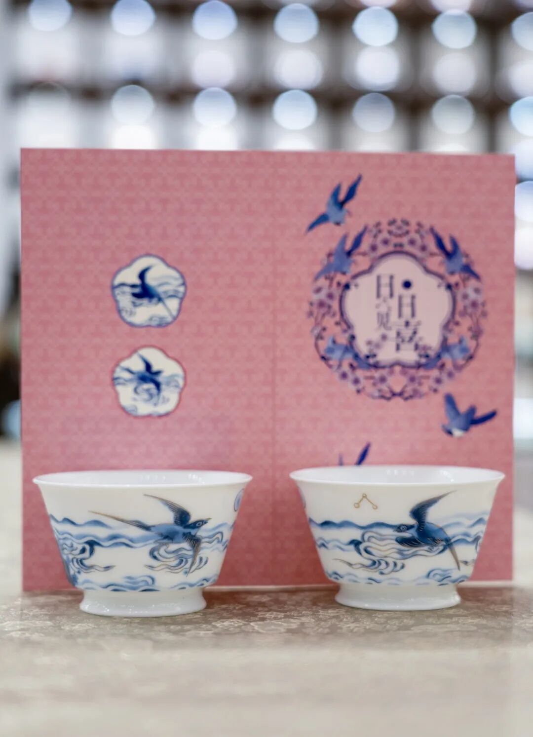 現(xiàn)以此館藏“日日見喜紋碗”為藍本,擷取原器傳統(tǒng)文化之精髓英華,以山云之間兩只相互飛迎的喜鵲構(gòu)圖,延承原器“日日見喜”之祈愿。