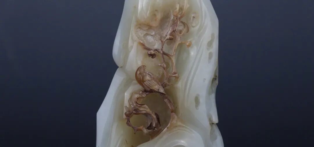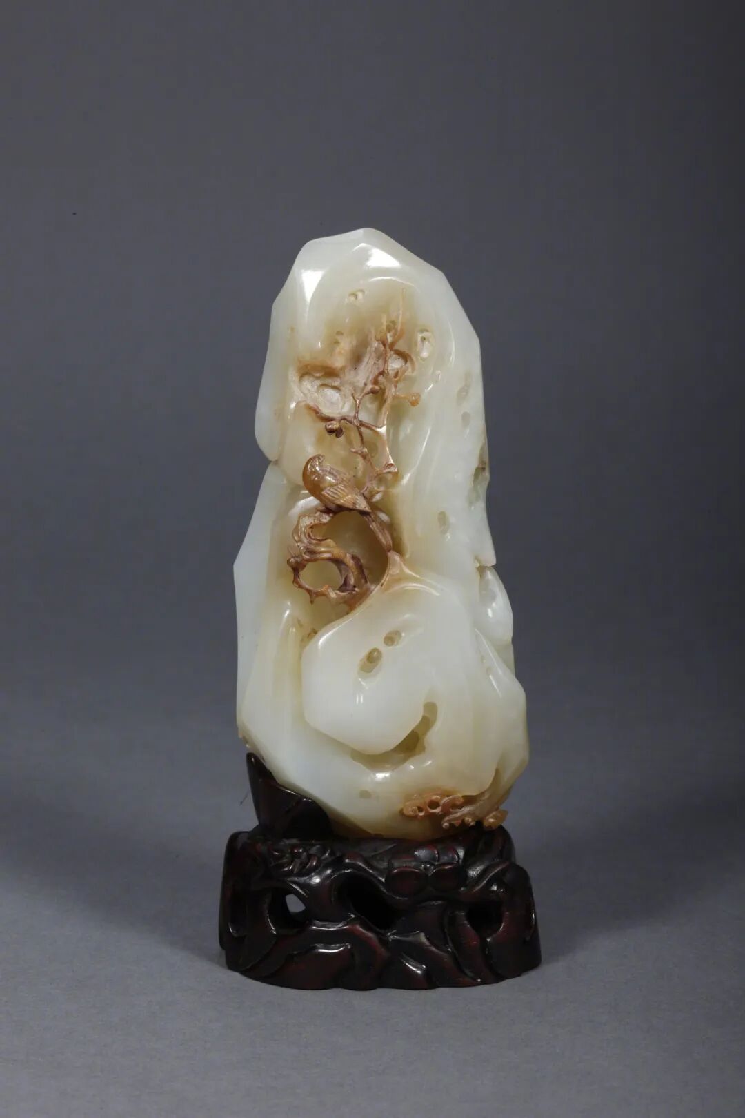 此件山子小器大意,以俏色巧雕一只喜鵲回首立于根植山石的梅樹枝頭,一山、一樹、一喜鵲,立體形象,寓“喜上眉梢”,也有獨占枝頭,不懼霜寒之意,凸顯文士之傲骨脫俗。