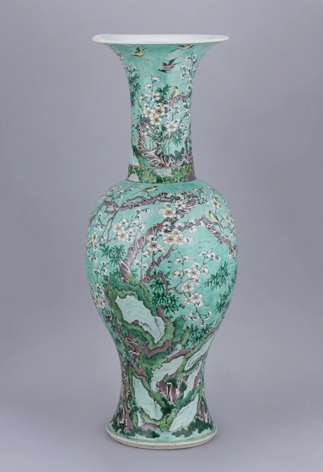 在全身綠釉的瓷胎上,繪洞石梅竹花鳥,其梅枝綿延而上,頂天立地,喜鵲上下錯落,或飛或立,一片歡騰,寓“喜樂平安”。