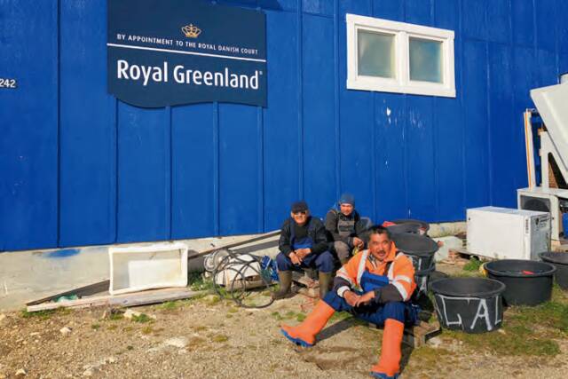 一個顏色對比強烈的畫面吸引了我的注意。一個身穿艷麗橘黃色外套和同色長筒靴的漁民坐在一座外墻上刷著青藍色油漆的房子邊,藍色的墻上面用白漆寫著“皇家格陵蘭水產(chǎn)丹麥皇家指定商品”。