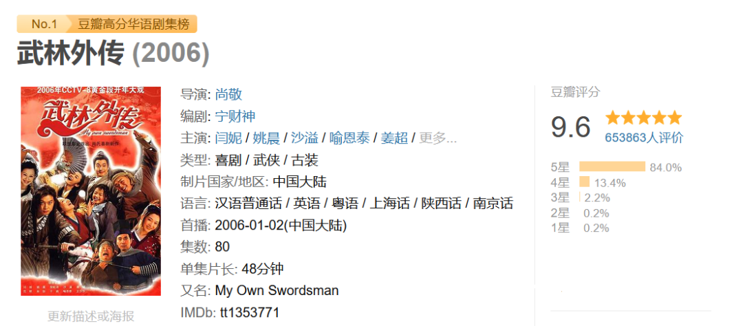 意外的是,第二天收視率爆升。結(jié)局第八十集播出的那天,恰好是大年三十,很多觀眾守著《武林外傳》,沒有看當天的春晚。