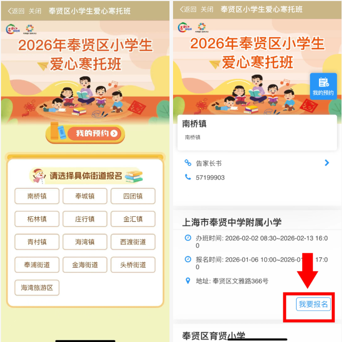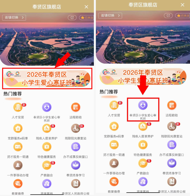 ① 點(diǎn)擊進(jìn)入“奉賢區(qū)小學(xué)生愛心寒托班”服務(wù)(圖片或者圖標(biāo)二選一即可)
