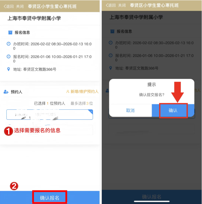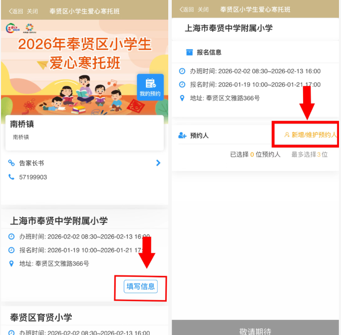 A:不是的!預(yù)報(bào)名信息提交成功,只是于系統(tǒng)內(nèi)登記了相關(guān)信息,為正式報(bào)名節(jié)省時(shí)間,請務(wù)必于2026年1月19日上午10:00準(zhǔn)時(shí)在“隨申辦—奉賢旗艦店—奉賢區(qū)小學(xué)生愛心寒托班”點(diǎn)擊報(bào)名,并準(zhǔn)時(shí)到達(dá)指定點(diǎn)位線下繳費(fèi),才算是完成報(bào)名。