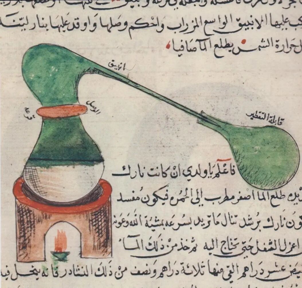 左圖為16世紀阿拉伯文獻中的蒸餾器;右圖為16世紀伊斯蘭世界的銀蒸餾器
