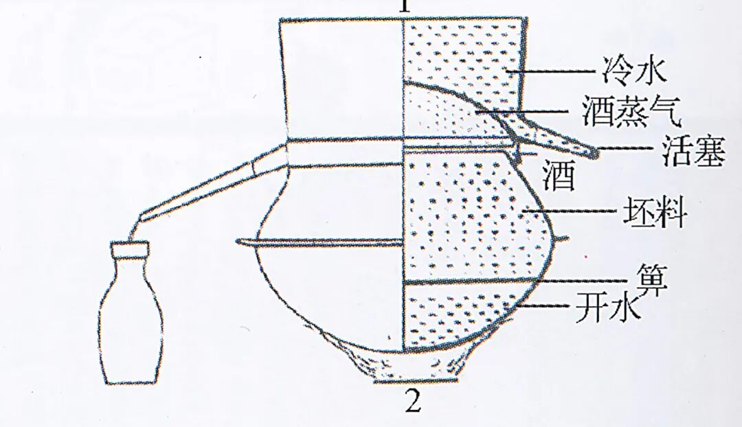 左圖為承德青龍出土元代蒸餾酒器;右圖為元代蒸餾酒器的結構示意圖