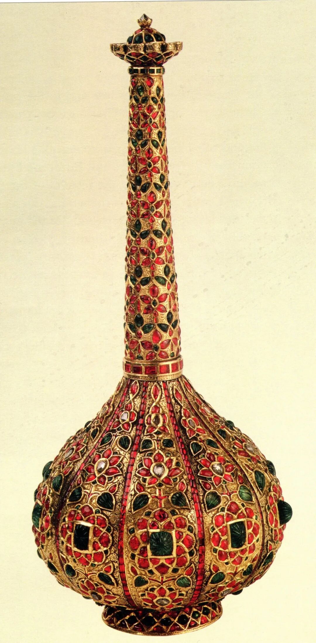 左圖為16—17世紀的波斯灑薔薇露(玫瑰水)玻璃瓶;右圖為18世紀莫臥兒王朝的金鑲寶石灑薔薇露瓶