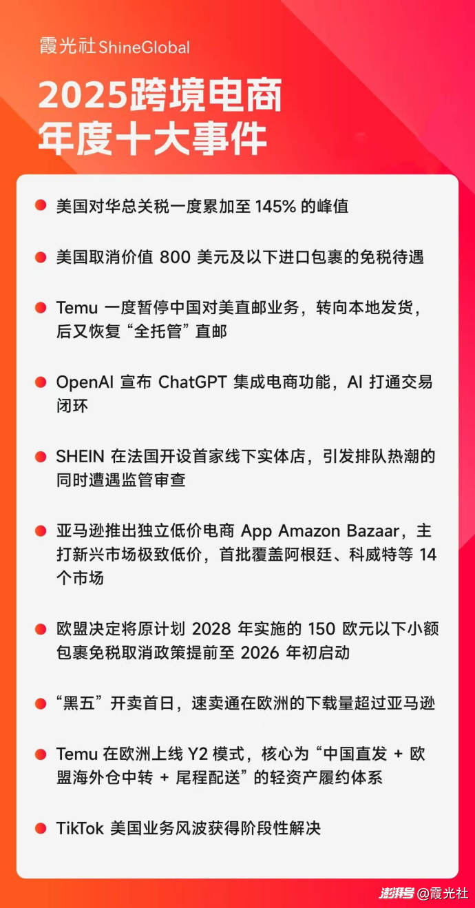 從2025年各家平臺(tái)的動(dòng)作可以看到,跨境電商已不再是簡(jiǎn)單的上線一個(gè)國(guó)家站點(diǎn),而是進(jìn)入了本地供給、履約、支付與合規(guī)深度綁定的階段。在全球免稅時(shí)代逐步結(jié)束的背景下,誰(shuí)能更快完成本地化、誰(shuí)能更穩(wěn)住多區(qū)域供給,正在成為平臺(tái)競(jìng)爭(zhēng)的新分水嶺。