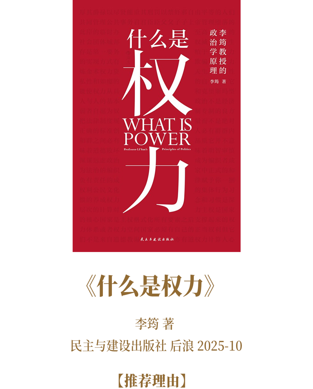 李筠以政治學者的銳見,為《什么是權力》注入本土視角。跳出西方理論窠臼,他從歷史傳統(tǒng)與現(xiàn)實語境出發(fā),拆解權力的本質(zhì)、邊界與實踐邏輯。書中既有中西思想碰撞,又有對本土權力爭議的冷靜剖析,將抽象概念落地為可感知的社會議題。文字兼具學理深度與通俗表達,讓讀者在思辨中理解:權力不是舶來品,而是需要在本土土壤中生長的社會共識。