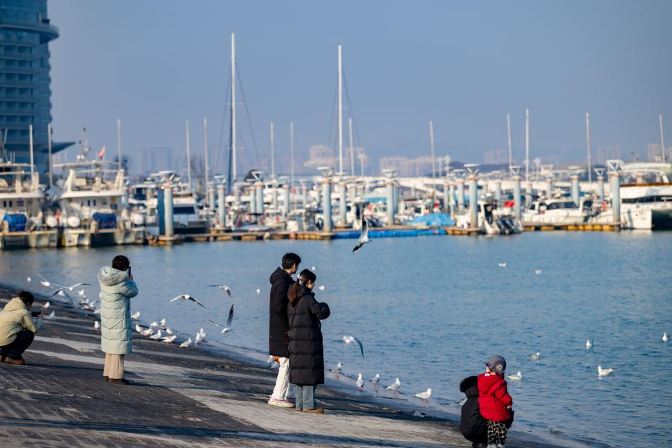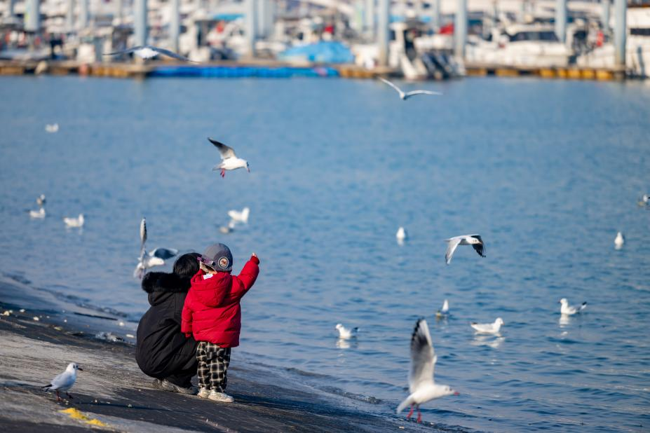 孩童伸手指向翩飛的鷗群,人與鷗的互動(dòng),揉碎了冬日的溫柔。劉晶 攝