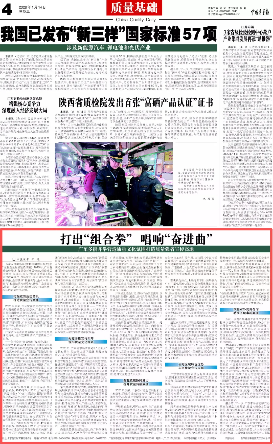 2026年1月14日,《中國質量報》第4版刊登《打出"組合拳" 唱響"奮進曲" 廣東多措并舉營造質量文化氛圍打造質量強省宣傳高地》一文,全文如下。