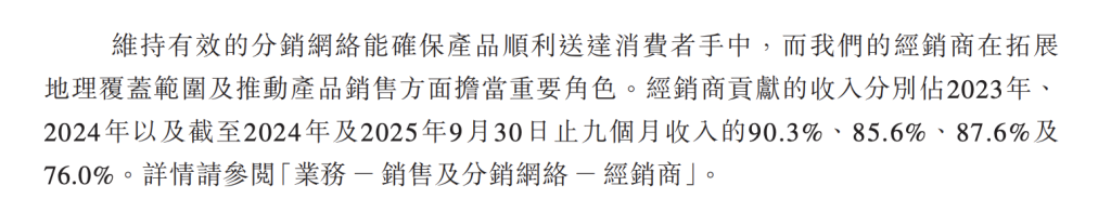 招股書顯示,截至2025年9月30日,云峰莫干山有875名經(jīng)銷商,覆蓋中國所有省份及45個海外國家及地區(qū)。2023年至2025年前9個月,經(jīng)銷商貢獻的收入占比分別達90.3%、85.6%和76%。
