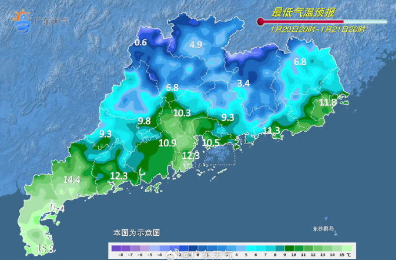 21日-22日,韶關(guān)、清遠北部陰天,有分散小雨,高海拔山區(qū)有雨夾雪或凍雨,其余市縣多云,局部有零星小雨。最低氣溫:粵北市縣1℃-6℃,其中韶關(guān)和清遠的高海拔山區(qū)-4℃-0℃,有冰凍,粵西市縣12℃-16℃,其余市縣7℃-10℃。