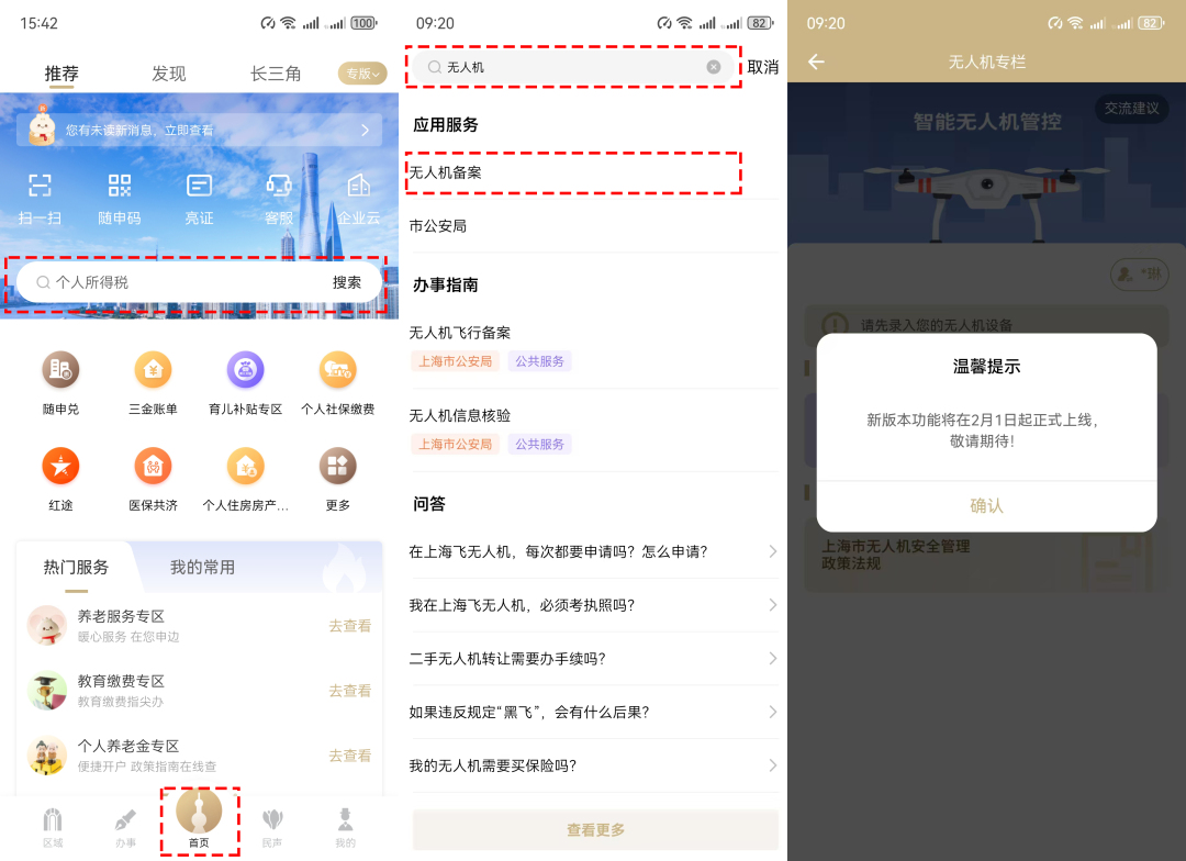 需要注意的是,適飛空域范圍為《上海市微型輕型小型無人駕駛航空器適飛空域范圍》綠色區(qū)域的真高120米以下空域。適飛空域范圍以外的空域為無人駕駛航空器管制空域。 2月1日起,市民可在隨申辦平臺查詢。