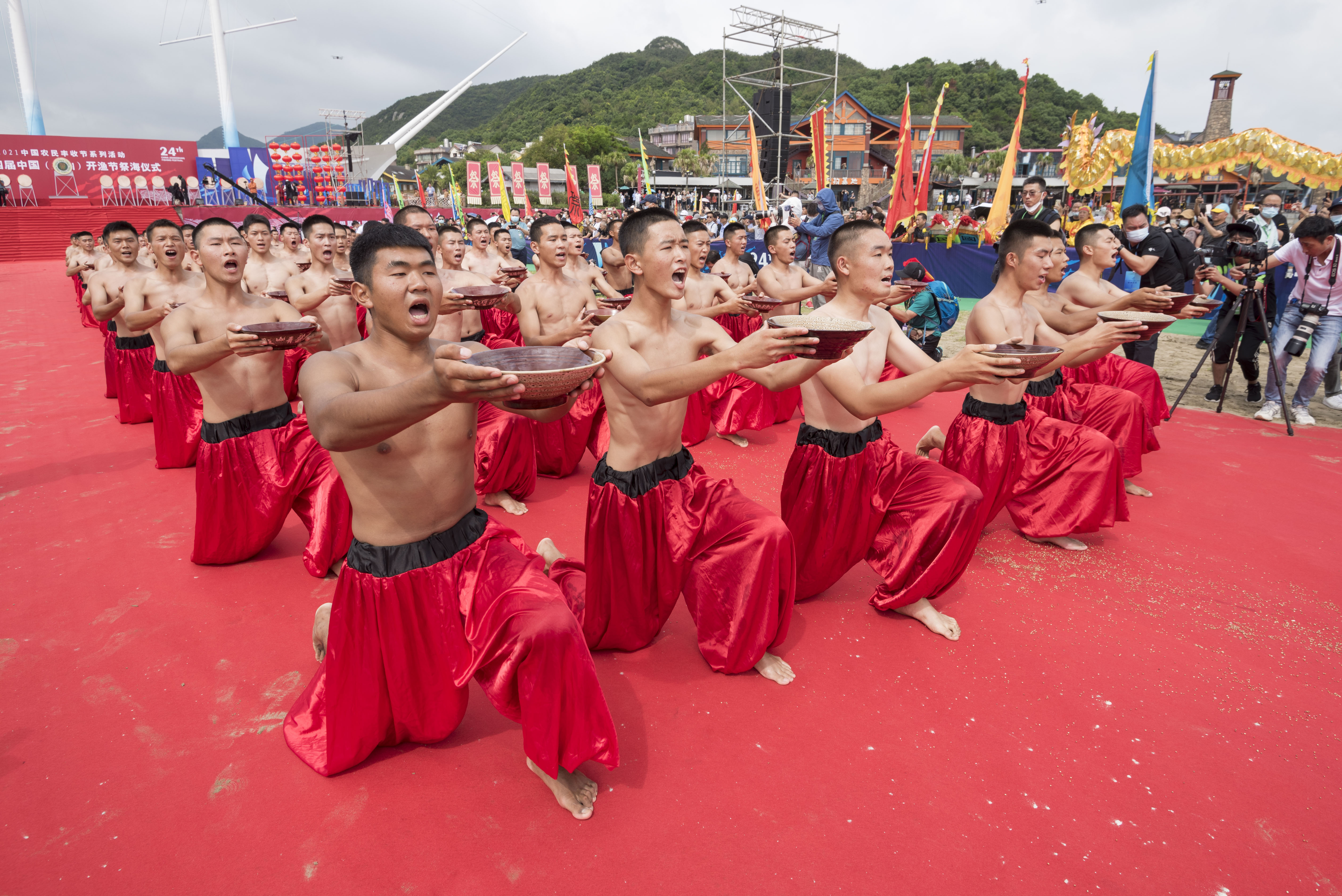 當(dāng)開(kāi)漁的鑼鼓敲響,千舟待發(fā)之際,最撼動(dòng)人心的,是祭海典禮上古老的三敬酒。一群赤膊的精壯漁家漢子,面色黑紅,面向蒼茫大海,人人雙手托起一只倒?jié)M黃酒的大海碗,高聲喊誦:“一敬酒,出入平安;再敬酒,波平浪靜;三敬酒,魚(yú)蝦滿艙。”