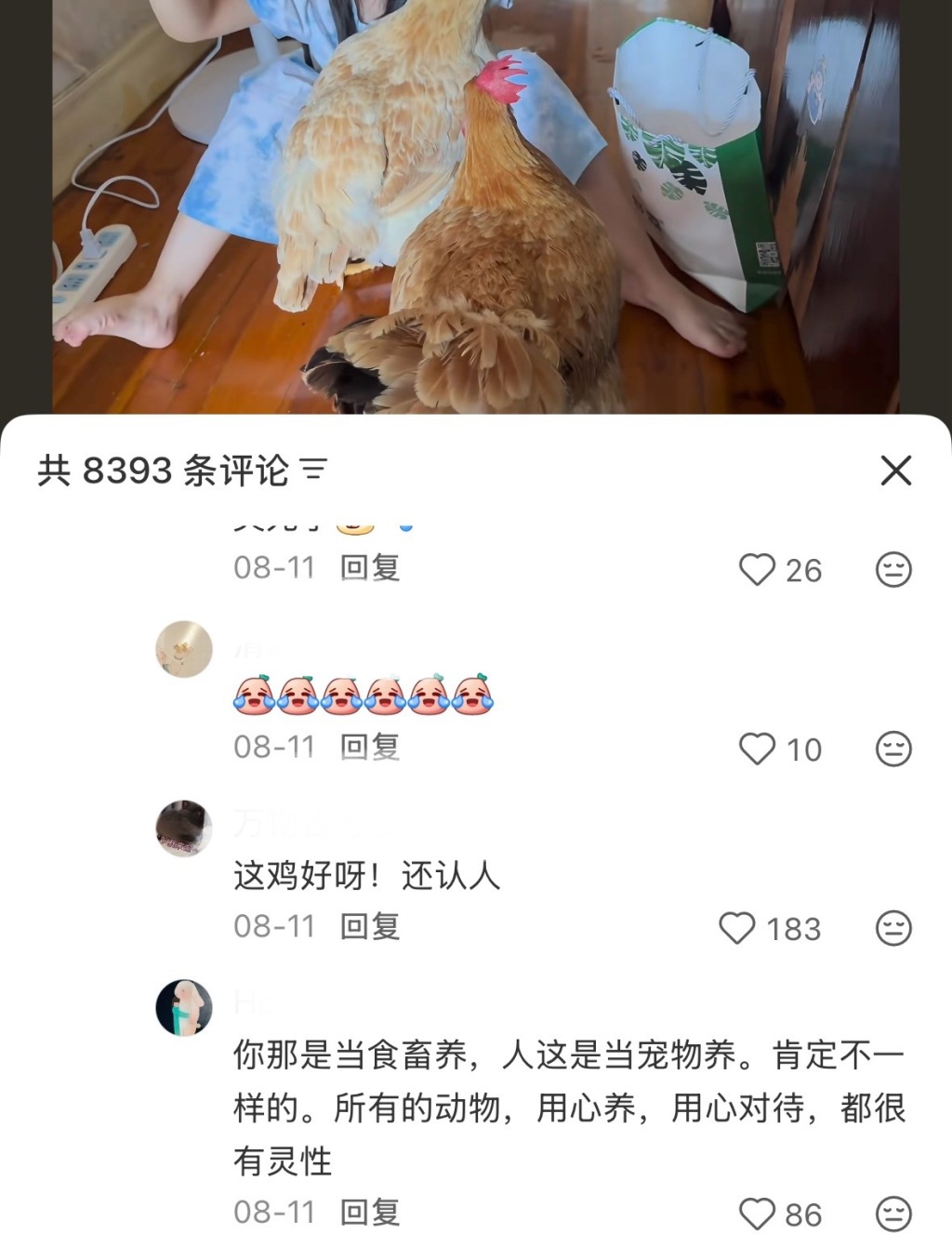 在這個小小的“養(yǎng)雞潮”的形成中,社交媒體扮演了重要的角色,讓雞的寵物化從偶然的個例轉變成一個有一定規(guī)模的小眾現(xiàn)象。小紅書等平臺上關于寵物雞的短視頻、故事分享和養(yǎng)護經驗討論,讓越來越多的人意識到雞可以是干凈的、香噴噴的、可愛親人的寵物。很多養(yǎng)雞內容也強調,比起貓狗,雞不但不失靈性,還有種種優(yōu)點:照料成本較低,對飼養(yǎng)者的經濟實力要求不高;如果養(yǎng)的是母雞,還能時不時生蛋回饋主人。因此,越來越多人愿意領養(yǎng)那些從養(yǎng)雞業(yè)的縫隙流出的肉雞和蛋雞,把它們作為寵物接回家。