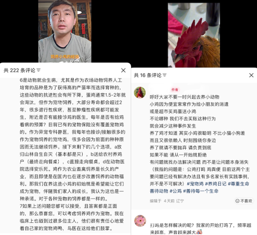 除了傳播養(yǎng)雞的科學知識,許多養(yǎng)雞知識博主著重倡導的理念是“負責任”,強調選擇把雞作為寵物前需三思,完整評估其潛在的困難;一旦開始養(yǎng)雞,就應該對它負責到底。這一責任話語的流行并不限于養(yǎng)雞社群中,而是一個中國社會近年來在和寵物有關的公共討論中逐漸浮現(xiàn)的一個共識。