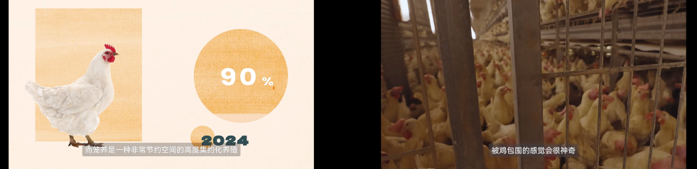 博主“一個袋子”制作的紀錄片調研了近年來國內興起的無籠養(yǎng)雞養(yǎng)殖場。圖中展示的是一個無籠養(yǎng)雞場,此類基于動物福利要求設計的養(yǎng)雞場約占全國的1%。數(shù)據(jù)表明,中國目前約90%的蛋雞皆處于高度集約化的籠養(yǎng)方式中。[1]