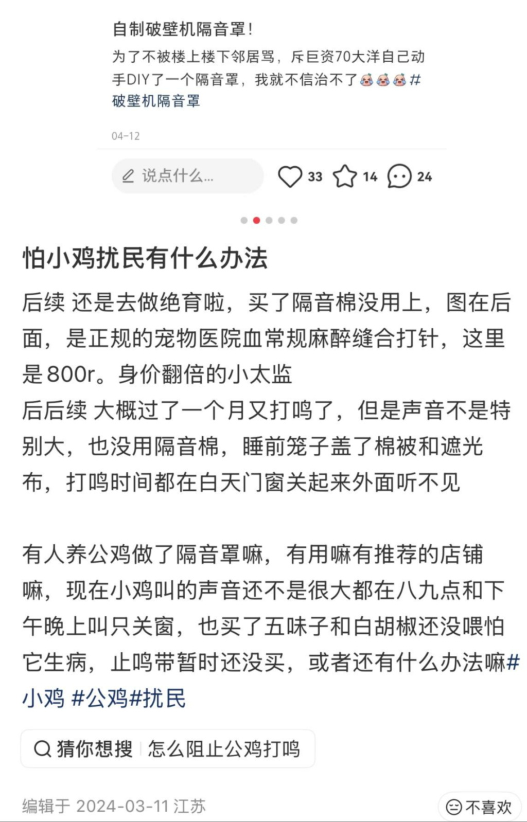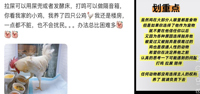 但是,想讓雞作為寵物與人共生以改變其被宰殺的命運,不只需要一顆惻隱之心,還需要具體的養(yǎng)寵知識作為基礎。未被完全“寵物化”的雞對都市生活的適應不良,是養(yǎng)雞人需要時刻遭遇的難題。特別是當公雞打鳴引發(fā)鄰里矛盾時,許多雞主人也難免萌生退意。因此,在社交平臺上,不時能看到許多雞主人求助的聲音:若不能解決公雞打鳴擾民的問題,這寵物就沒辦法再養(yǎng)下去了。