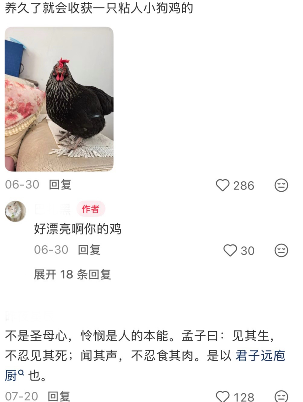 然而,在關于都市養(yǎng)雞的具體討論中,人們也開始有意識地超越“圣母”標簽,并基于具有中國本土歷史文化基礎的倫理話語,試圖超越幽靈般無處不在的“圣母心”指控。有一位網(wǎng)友就引用《孟子》中的名句,“君子之于禽獸也,見其生,不忍見其死;聞其聲,不忍食其肉”,強調對于非人動物境遇的同情是人類正當?shù)膫惱矸磻?,不應被貶抑——“不是圣母心,憐憫是人的本能”。