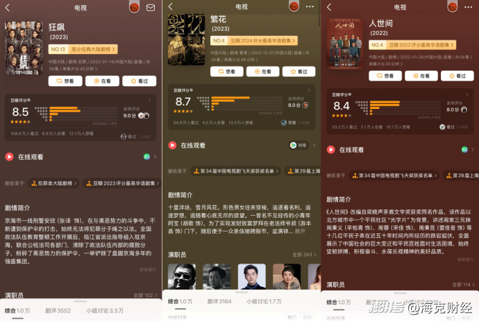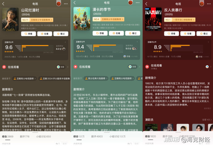 更重要的是,2025年的流量與口碑更為割裂?!渡交€漫時(shí)》評(píng)分人數(shù)超過24萬,豆瓣評(píng)分9.4的2024年頭部劇集《漫長(zhǎng)的季節(jié)》評(píng)分人數(shù)為115萬,但《反人類暴行》的評(píng)分人數(shù)目前僅6.5萬。