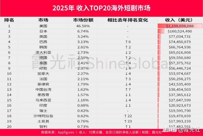 首先,市場體量差距顯著。據(jù)DataEye研究院數(shù)據(jù),2025年國內(nèi)短?。ê嫒藙∨cAI漫?。┚C合產(chǎn)值約1000億元,其中真人短?。ê赓M與付費)規(guī)模達800億元,較同期國內(nèi)電影總票房(518.32億元)高出近兩倍;而海外短劇市場營收僅徘徊在20-25億美元之間,與國內(nèi)市場存在6-7倍的差距,整體仍處于早期發(fā)展階段。
