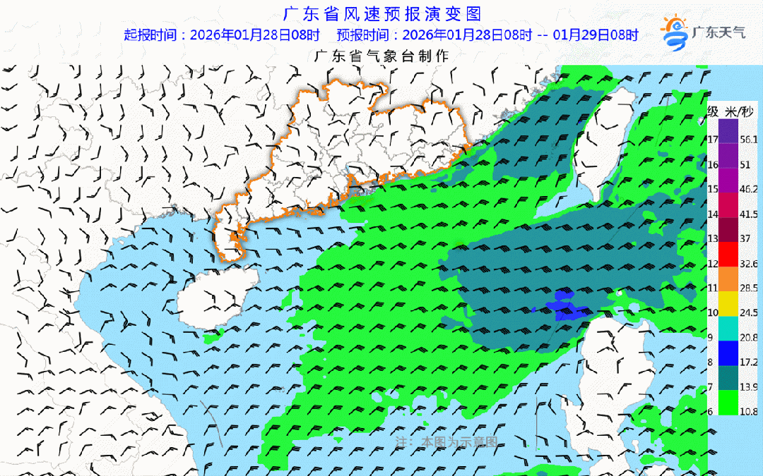 預(yù)計(jì)28-30日白天,粵東海面東北風(fēng)6級(jí)陣風(fēng)7~8級(jí),廣東中西部海面東北到東風(fēng)5~6級(jí)陣風(fēng)7級(jí)。