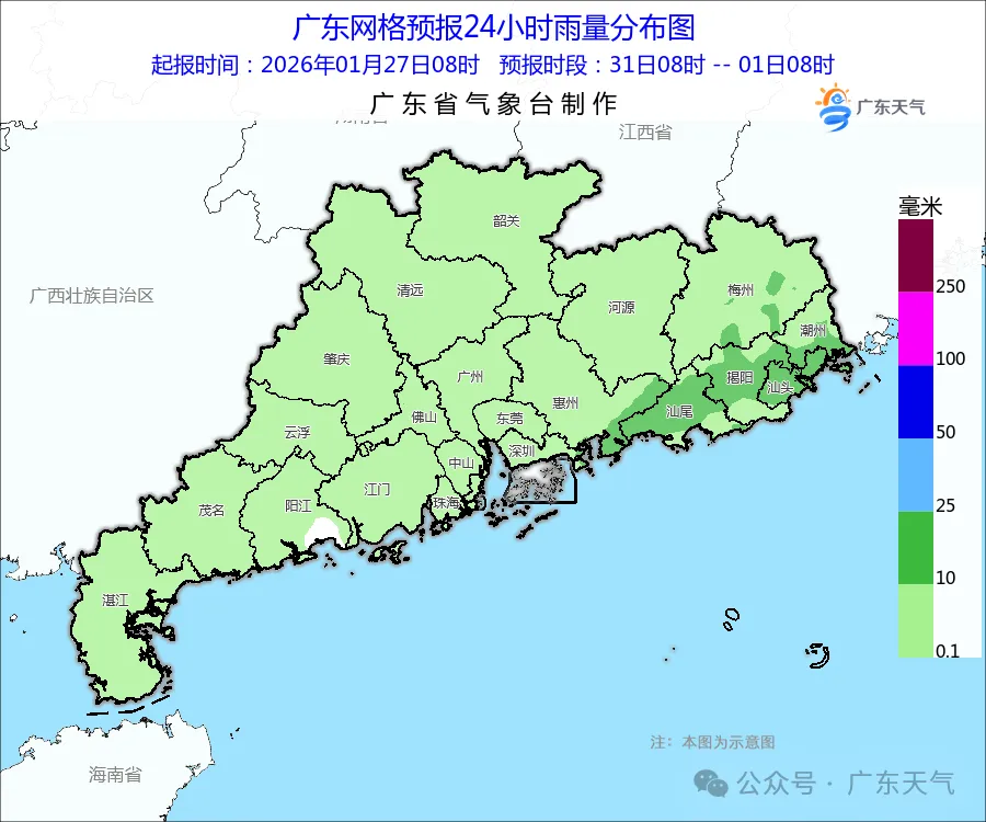 31日,中北部、粵東市縣陰天,有小雨局部中雨,其余市縣多云到陰天,有分散小雨,部分市縣早晨有輕霧或霧。最低氣溫:粵北大部、珠三角北部市縣7~11℃,南部市縣16~20℃,其余市縣12~16℃。