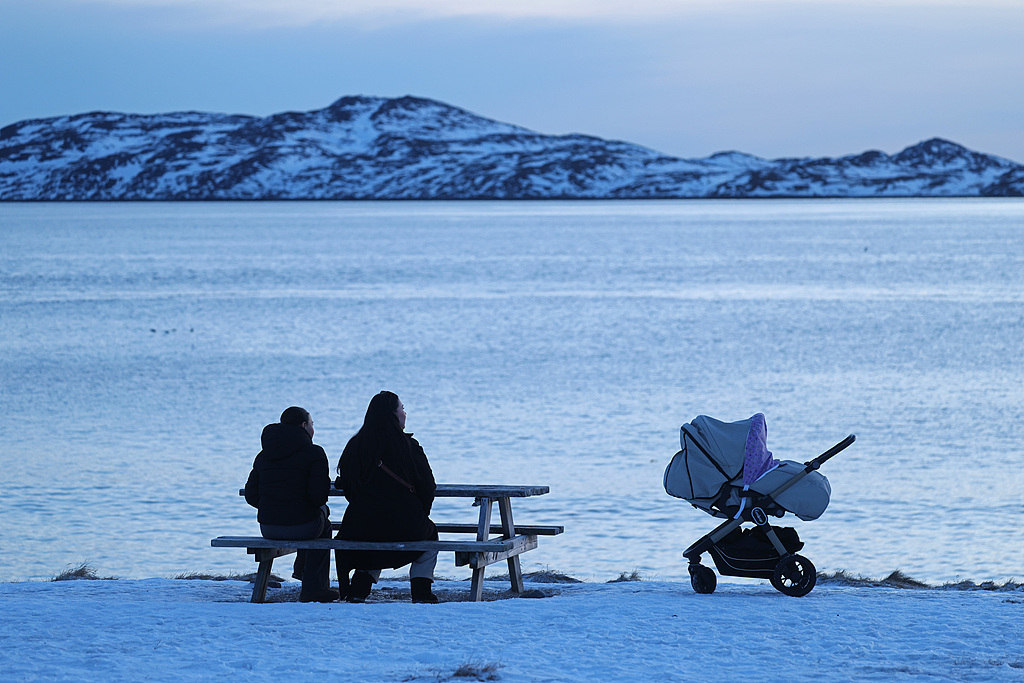 當(dāng)?shù)貢r(shí)間2026年1月25日,格陵蘭島努克,人們帶著嬰兒車(chē)坐在被白雪覆蓋的海灘上。視覺(jué)中國(guó) 圖