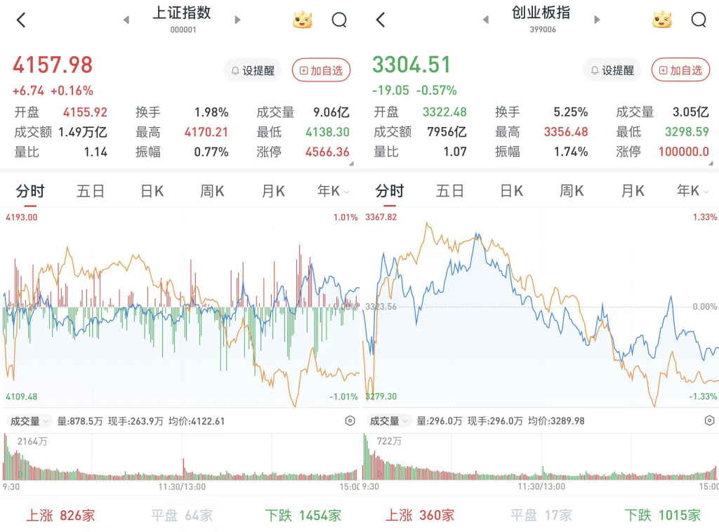 至收盤,上證綜指漲0.16%,報4157.98點;科創(chuàng)50指數(shù)跌3.03%,報1507.64點;深證成指跌0.3%,報14300.08點;創(chuàng)業(yè)板指跌0.57%,報3304.51點。