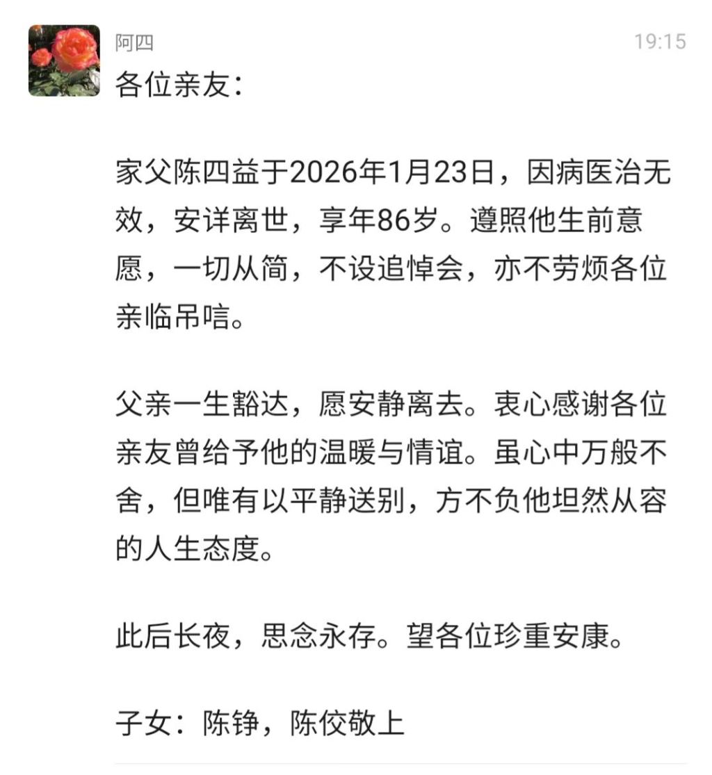 1月29日,《讀書》雜志公號文章刊文紀念:2026年1月23日,著名新聞出版家、雜文家陳四益先生離世,享年86歲。這篇悼文以“那道開篇的風景”為題,既是對陳四益過往24年間在《讀書》封二專欄創(chuàng)作的高度概括,亦如一粒石子投入波平如鏡的湖中,蕩起的漣漪映照出幾代讀者每每開卷“讀書”,必先翻閱其作品的閱讀記憶。