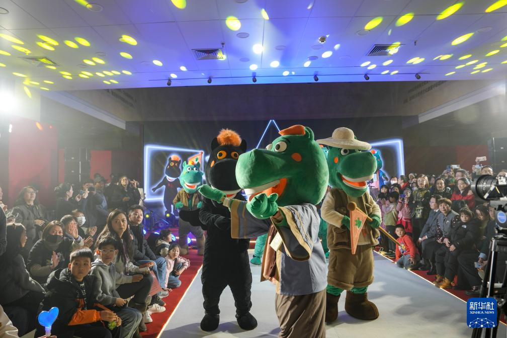1月26日晚,在甘肅省博物館一樓大廳,銅奔馬IP人偶在“馬力全開——博物館啟航夜”活動(dòng)現(xiàn)場與觀眾互動(dòng)。新華社記者 郎兵兵 攝
