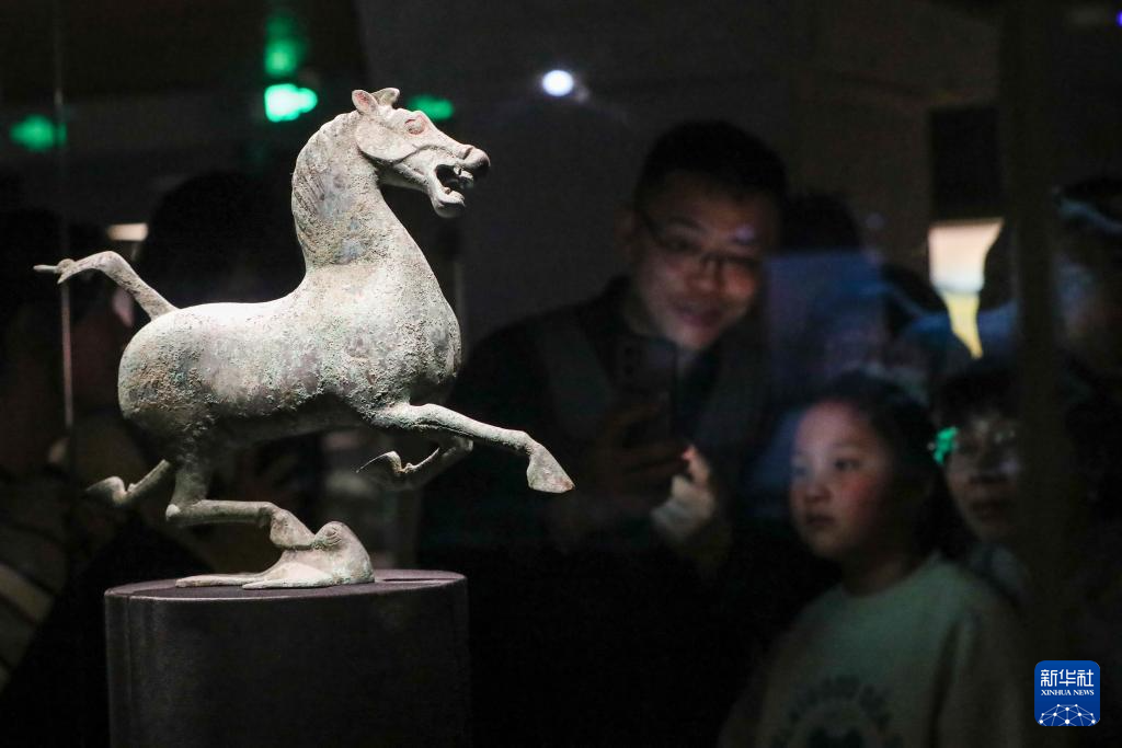 1月26日晚,觀眾在甘肅省博物館絲綢之路文明展廳參觀銅奔馬(復(fù)制品)。新華社記者 郎兵兵 攝