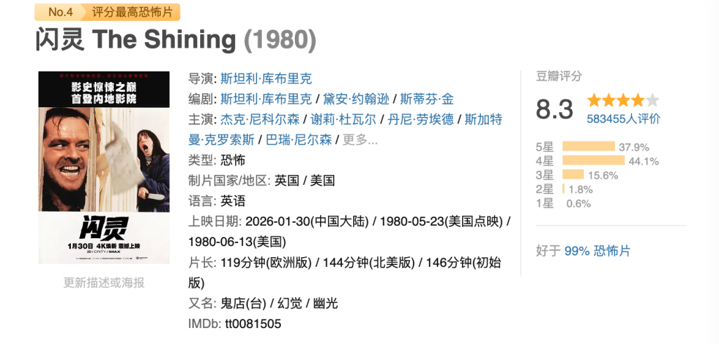 電影《閃靈》(斯坦利·庫(kù)布里克執(zhí)導(dǎo)1980年版)的豆瓣評(píng)分