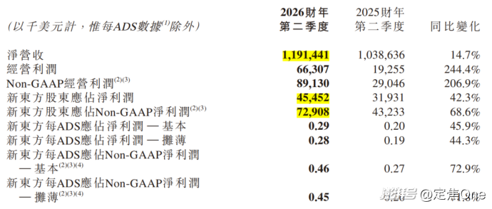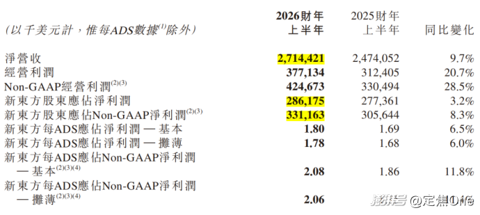 2026財(cái)年上半財(cái)年,新東方的整體業(yè)績(jī)呈現(xiàn)出明顯的修復(fù)跡象。期內(nèi)凈營(yíng)收27.14億美元,同比增長(zhǎng)9.7%,凈利潤(rùn)2.86億美元,同比增長(zhǎng)3.2%;經(jīng)調(diào)整凈利潤(rùn)為3.31億美元,同比增長(zhǎng)8.3%。