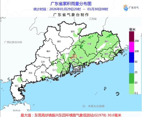 天氣實(shí)況:29日白天,廣東大部白天最高氣溫超過20℃,其中茂名信宜錄得全省最高氣溫26.1℃。29日夜間到30日早晨,珠三角以東市縣出現(xiàn)了小雨局部中雨,其余市縣多云為主;大部分市縣最低氣溫較29日上升或大致持平,其中韶關(guān)仁化錄得全省最低氣溫10.1℃。